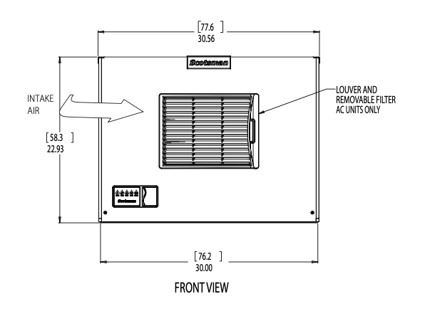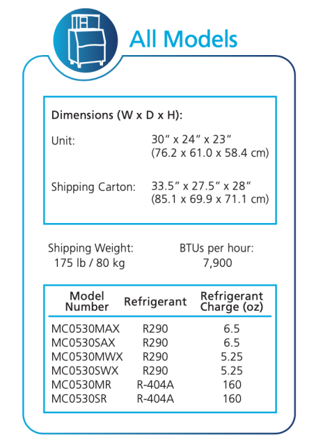 Dimensiones: 30" W x 24" D x 23" H, Caja de envío: 33,5" de ancho x 27,5" de profundidad x 28" de alto, Peso de envío: 175 lb, Opciones de condensador disponibles: Aire, Remoto, Agua Eléctrico, Base Eléctrica, Voltios/Hz/Fase: 115/60/1