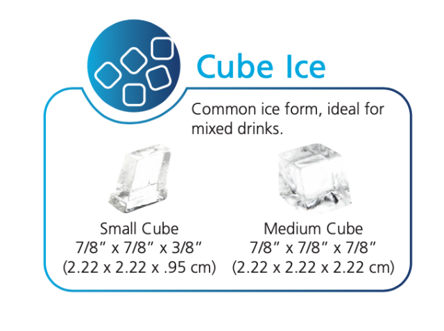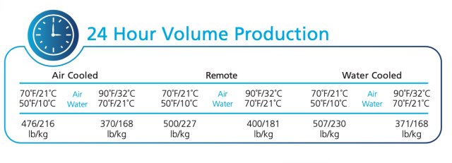 Máquina de hielo tipo cubo con una producción 24 horas: 476 libras a 70/50, 370 libras a 90/70